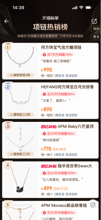 像HEFANG这样通过淘宝出海的品牌不在少数,如中式珠宝品牌庆祥泰、布达拉宫旗舰店等天猫商家,今年双11在淘宝出海的成交增长超20%。据了解,目前已有超六成的天猫珠宝饰品商家通过淘宝出海,将中国的产品带给海外消费者。在国际珠宝市场,也有越来越多中国品牌的身影。