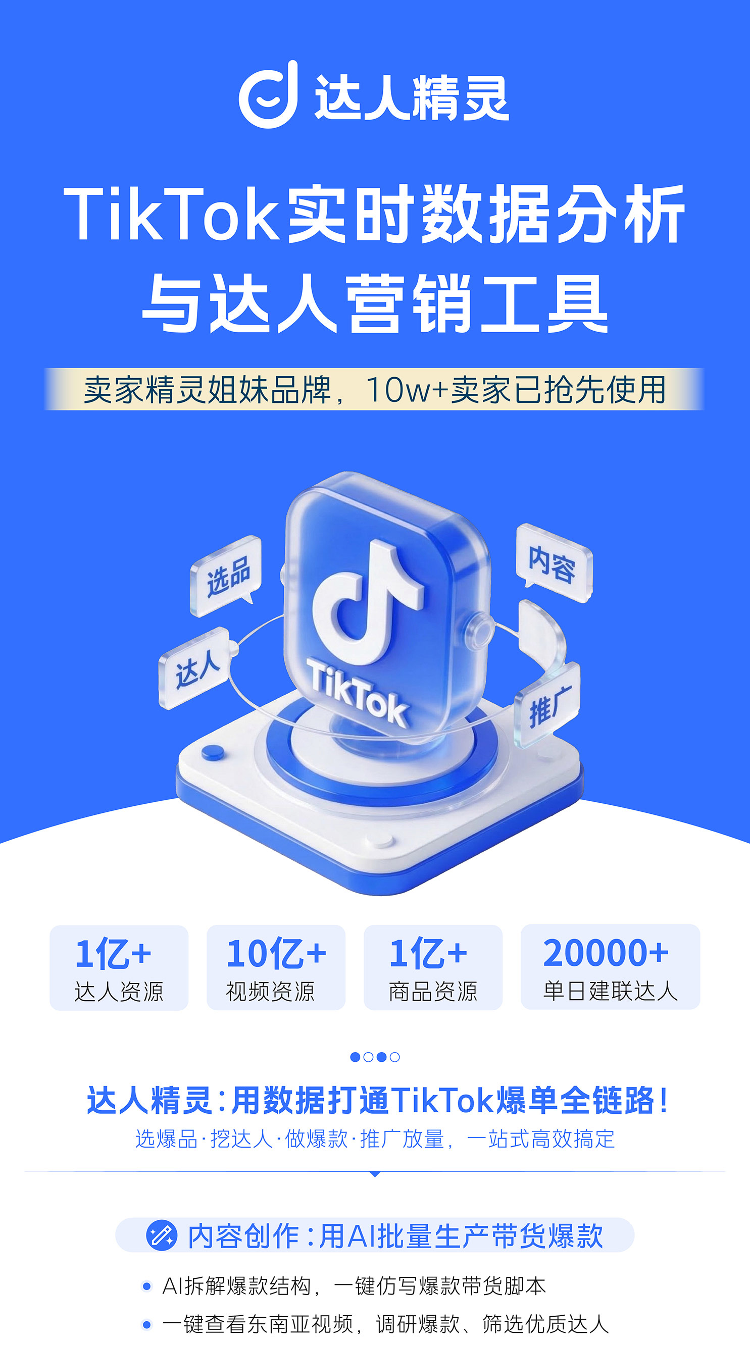 达人精灵,卖家精灵姐妹品牌,TikTok实时数据分析与达人营销工具,10W卖家已抢先使用,让TikTok运营更高效、爆单更轻松!
